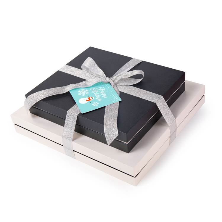 Our Holiday Grand Elite 2 Tier Tower is a festive treat for your valued customers! This 2-tier tower contains the following items: 18pc Assorted Truffles Box and a 20pc Truffle Cups Box. Both boxes are tied with a silver ribbon with a "Happy Holidays" hang tag.