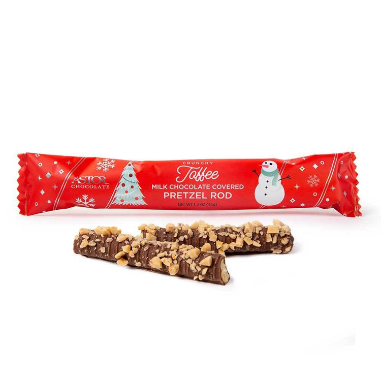 Our Holiday Milk Chocolate Toffee Pretzel Rods are delicious and festive treats for your valued customers! Milk chocolate is topped with sweet toffee covering a salty pretzel rod for the perfect holiday-inspired treat!