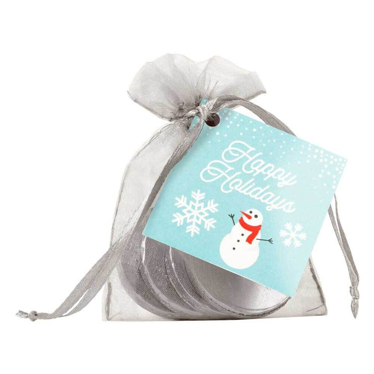 Our Silver Chiffon Pouch filled with silver holiday coins is the perfect festive treat for your valued customers! Each pouch is packed with 4 milk chocolate coins covered in silver foil. Each chiffon bag has a "Happy Holidays" hangtag.